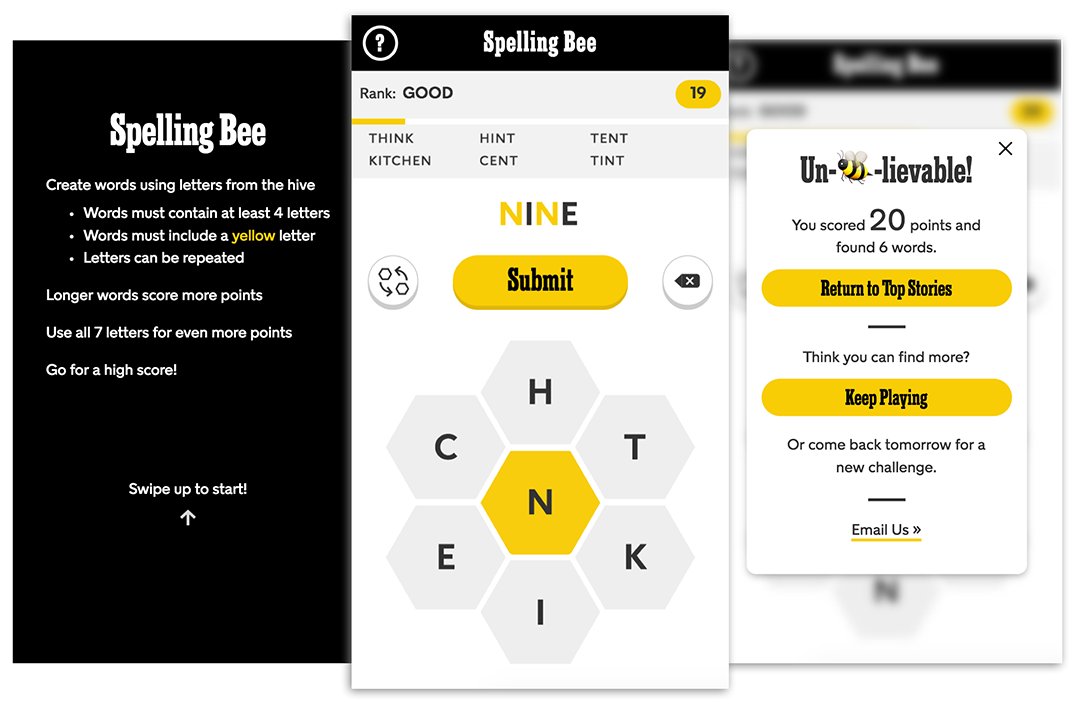 How to get more points in the spelling bee? Jul 12, 2021 · published by derrick on june 18, 2021. The highest score ever was 537 on january 22, 2021. What are the answers to the new york times puzzle? Jul 08, 2021 · our experts create engaging word and visual games — in 2014 we introduced the mini crossword, followed by spelling bee, letter boxed, tiles and vertex. We'll continue to make new games our. The more words they can create, the more points they will get. Oct 16, 2020 · spelling bee — a puzzle in which players try to make words from a set of seven unique letters while using the center letter at least once — is the first of five digital games created by the new. To play and a global "hivemind" that exists to troll a new. Our experts create engaging word and visual games — in 2014 we introduced the mini crossword, followed by spelling bee, letter boxed, tiles and vertex. How did the spelling bee get its name? These are answers and solution to the new york times spelling bee puzzle. The game's path to success was paved with a beehive in the sunday magazine, solvers waking up at 3 a.m.